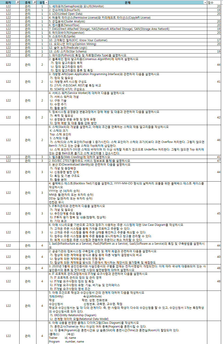 122회 정보관리기술사 필기시험 문항별 득점표(채점관 3인 채점 합계점수, 즉 교시당 평균 180점 이상이면 합격)