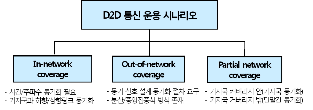 기지국 커버리지 밖에 존재하는 D2D 단말들은 단말들 간 별도의 동기를 수행하기 때문에 상호 간섭을 유발할 수 있음. 따라서 이를 미연에 방지할 수 있는 상호 간섭 제어 방안에 대한 연구 필요.- D2D 서비스 시나리오는 상업용 서비스 활용과 공공안전과 관련된 서비스 활용으로 크게 분류할 수 있음.